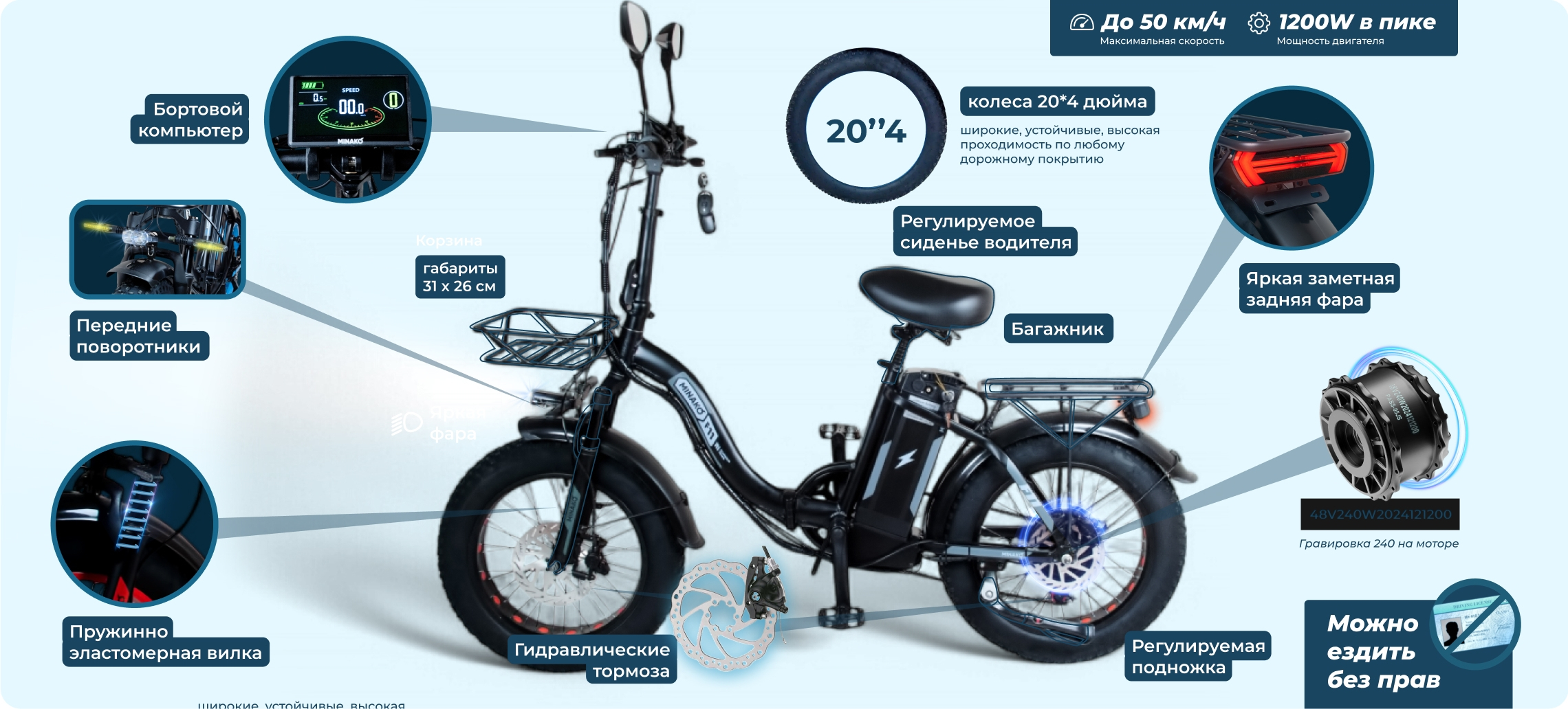 Электровелосипед Minako F11 Pro 20ah, синий