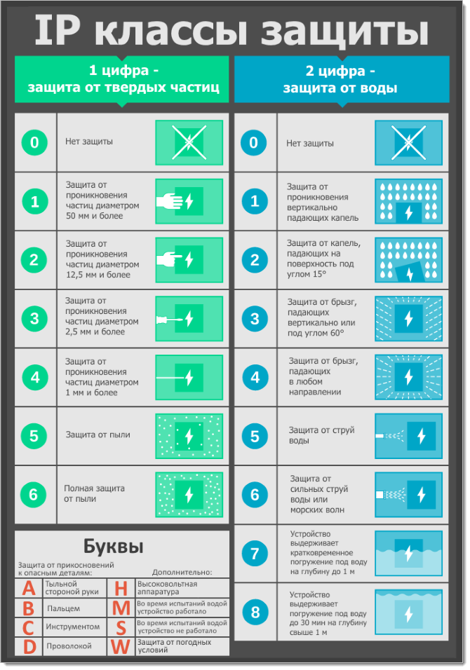 • Защита класса 8 предполагает, что устройство будет работать в полностью погруженном состоянии длительное время. Если вместо какой-либо из цифр пишется X - это означает, что защита от данного воздействия не тестировалась.